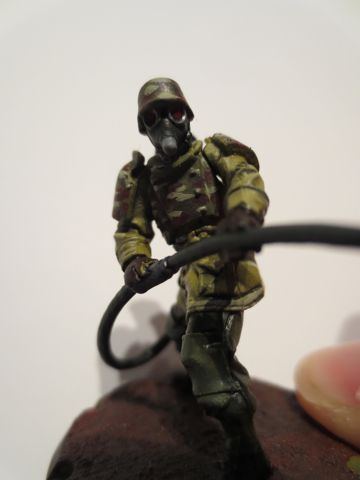 My finished camo. Now paint the flammenwerfer's tube using the same color as the gasmask (aka PIP Cryx Bane base), paint the gloves using Umbral Umber. |