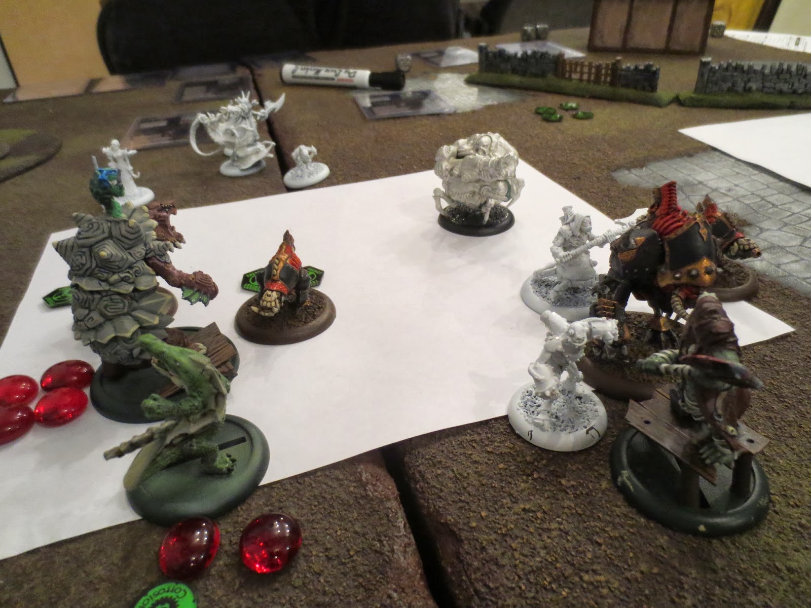 Barnabas' appetite for destruction prompted me into charging the Slayer, using the feat to knock down absolutely every enemy model other than Skarre and then attack the slayer again and again with my reach weapon... After three attacks, I realized the armour 21 was quite problematic (I think two attacks completely bounced on the Slayer's metal plating) so I decided to instead cast the Snapper's animus on Barnabas and sit with one fury.